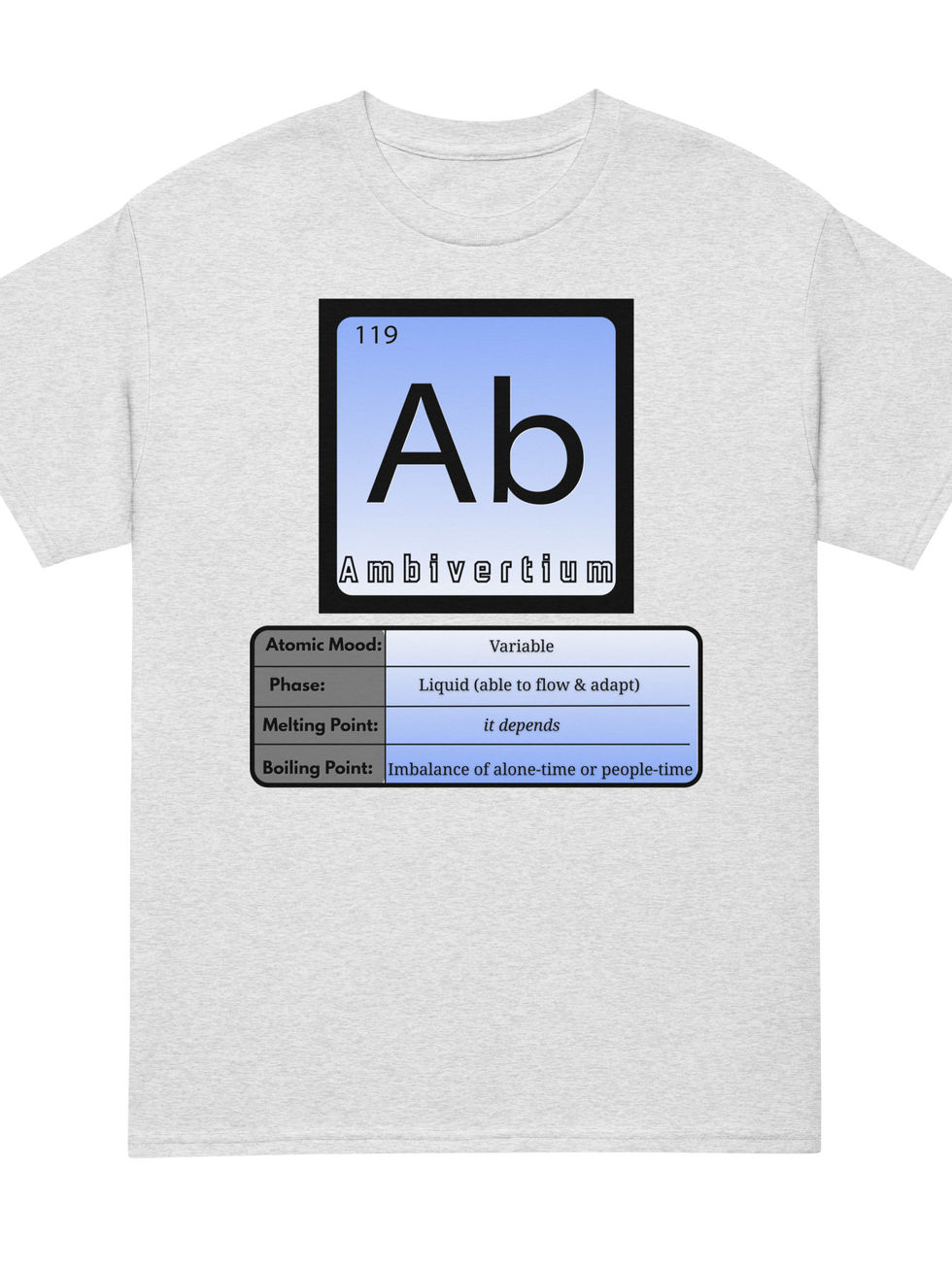 Ab - Ambivertion. Atomic number: Depends on the day. The Periodic Table of Personality tee for those whose social chemistry changes based on environmental conditions. Stable in groups AND alone. A true noble element. Properties: Adaptable, balanced, "it depends." Warning: Unpredictable social energy levels.